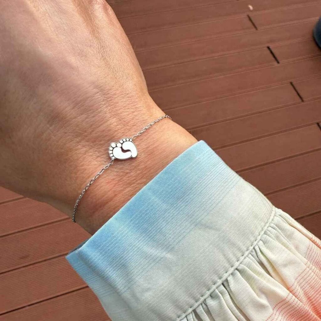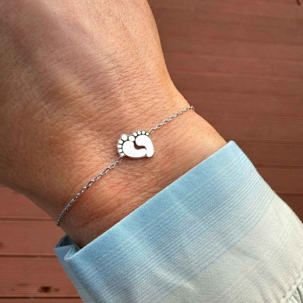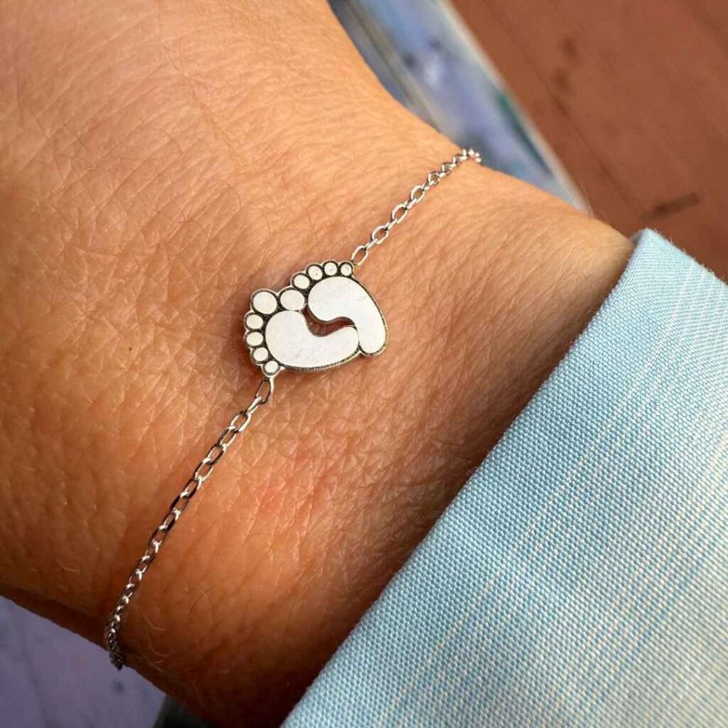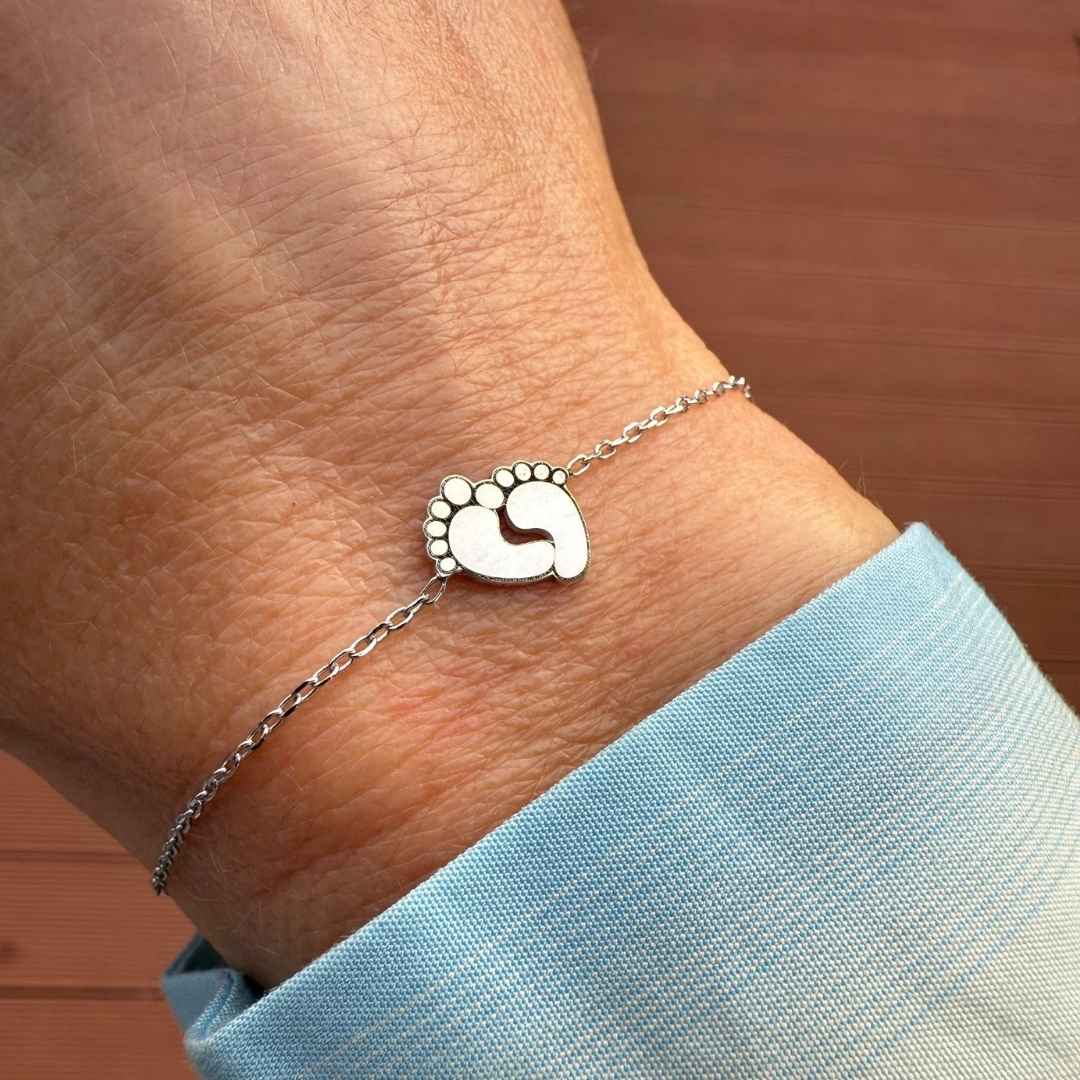O brățară care surprinde gingășia începuturilor, cu două tălpițe mici ce poartă emoțiile celor mai prețioase momente.
